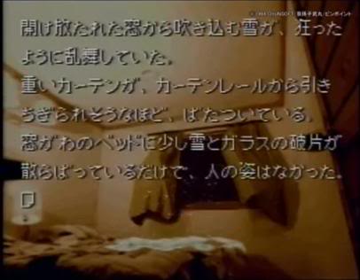 And the fact that I discuss the game here pretty much gives it away, but Kamaitachi no Yoru is basically nothing more or less than an orthodox mystery sound novel. The scenario was penned by Abiko Takemaru, a mystery writer who seems to have a very close connection with Chunsoft (he also contributed to 428 ~ Fuusa sareta Shibuya de and Trick X Logic). The story is a pretty basic one: protagonists Tooru and his sorta girlfriend Mari are on vacation, staying at the ski pension of Mari's uncle. One night, during a snow storm, one of the guests, or to be exact, many pieces of one of the guests are found in his room. A murder! In a secluded ski lodge in a snow storm? Who would have expected that?! But the more important question is: Who did this? Someone from outside? Or one of the people in the pension? Or are the titular kamaitachi to blame?